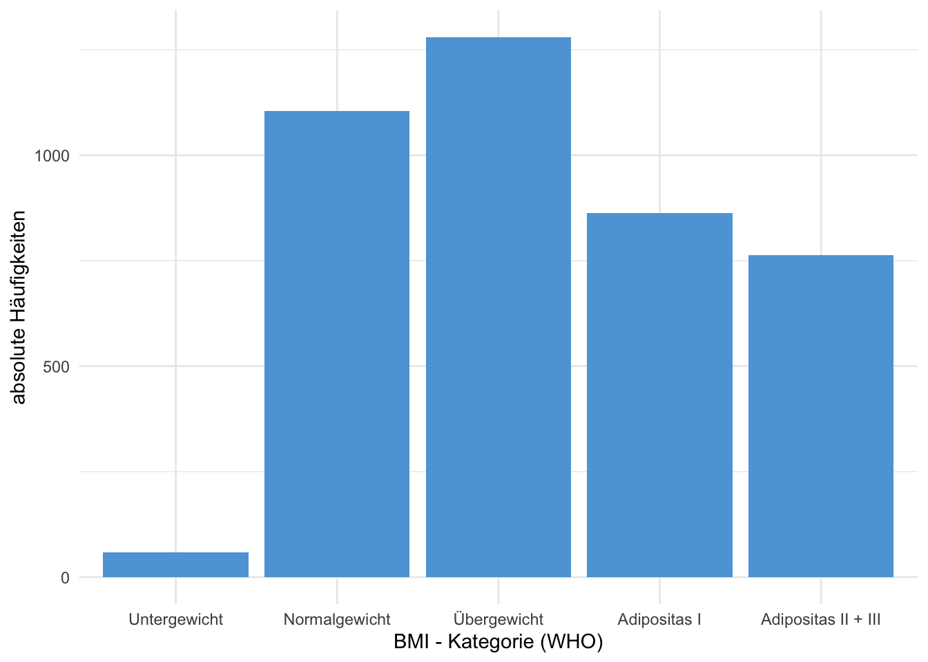 Beispiel 4.4 (Häufigkeiten BMI Kategorien laut WHO in NHANES Daten) In der Tabelle 4.3 sind die absoluten und relativen Häufigkeiten der BMI-Kategorien im NHANES Datensatz aufgelistet. In der Abbildung 4.2 sind die absoluten Häufigkeiten als Balkendiagramm dargestellt.