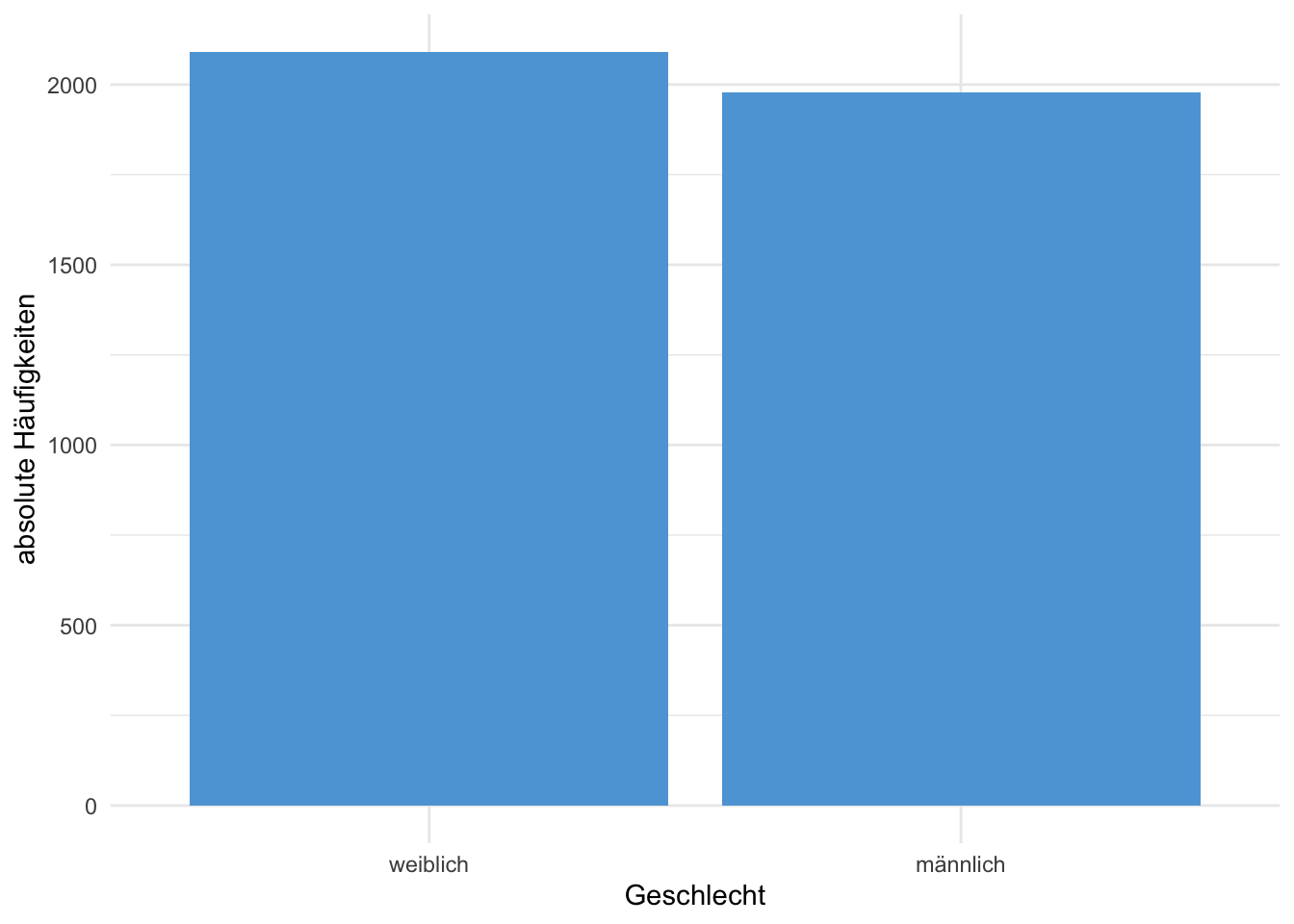 Beispiel 4.3 (Häufigkeiten Geschlecht NHANES Daten) In der Tabelle 4.2 sind die absoluten und relativen Häufigkeiten der weiblichen und männlichen Personen im NHANES Datensatz aufgelistet. In der Abbildung 4.1 sind die absoluten Häufigkeiten als Balkendiagramm dargestellt.