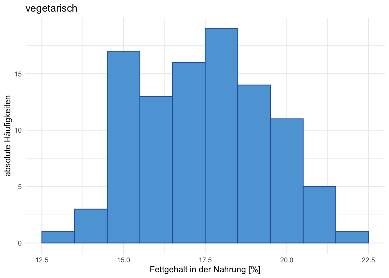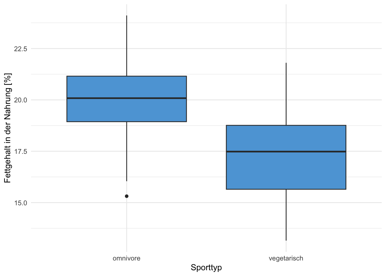 Übung 4.13 Es wurde bei 100 Omnivore und bei 100 Vegetarier der mittlere Fettgehalt (in %) der Nahrung von einer Woche gemessen. Die Daten sind in den beiden Grafiken A und B dargestellt. Beschreiben Sie alle Aspekte, die Sie aus den beiden Grafiken ablesen und interpretieren Sie diese.