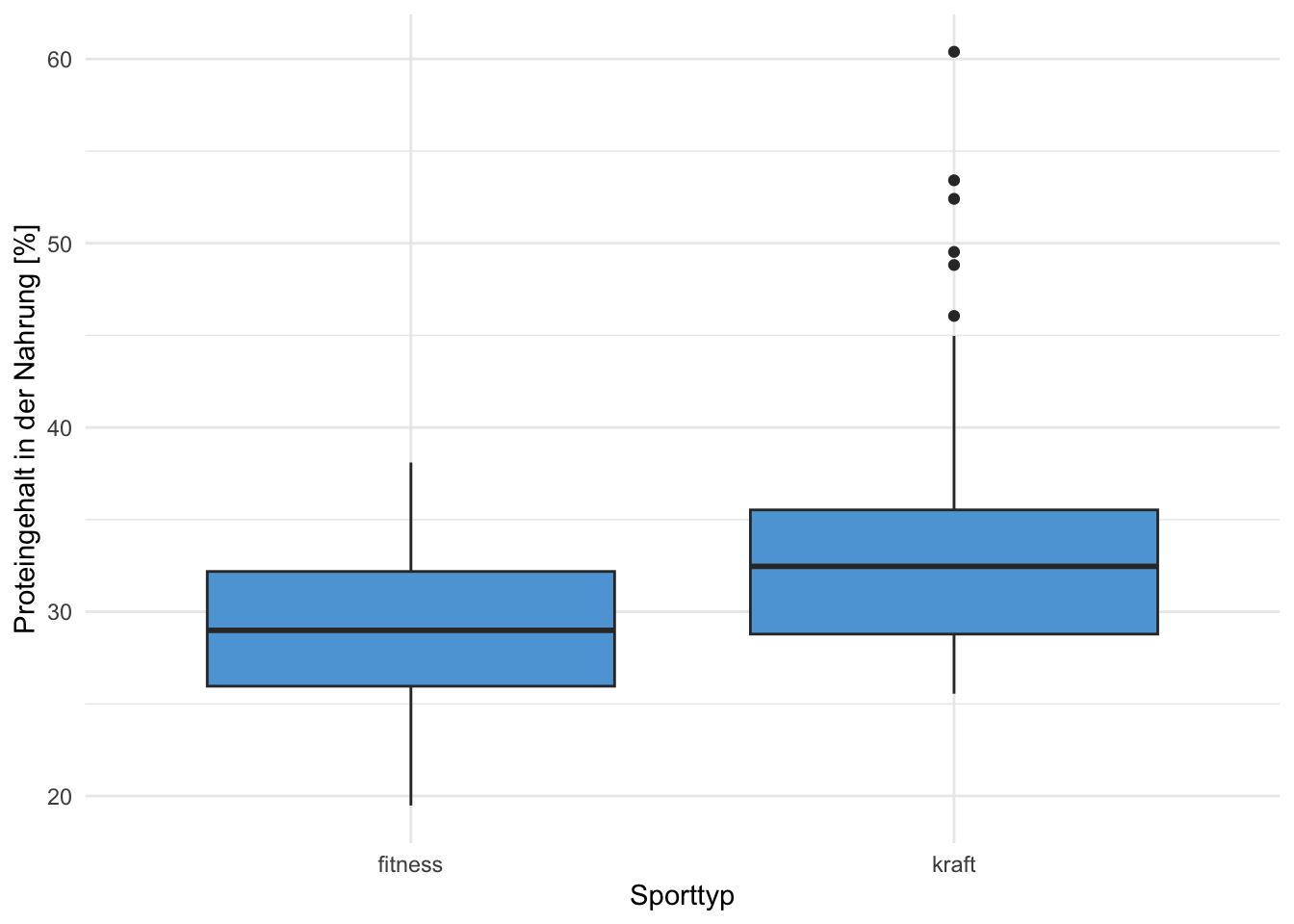 Übung 4.12 Es wurde bei 100 Kraft-Sportler:innen und bei 100 Fitness-Sportler:innen der mittlere Proteingehalt (in %) der Nahrung von einer Woche gemessen. Die Daten sind in den beiden Grafiken A und B dargestellt. Beschreiben Sie alle Aspekte, die Sie aus den beiden Grafiken ablesen und interpretieren Sie diese.