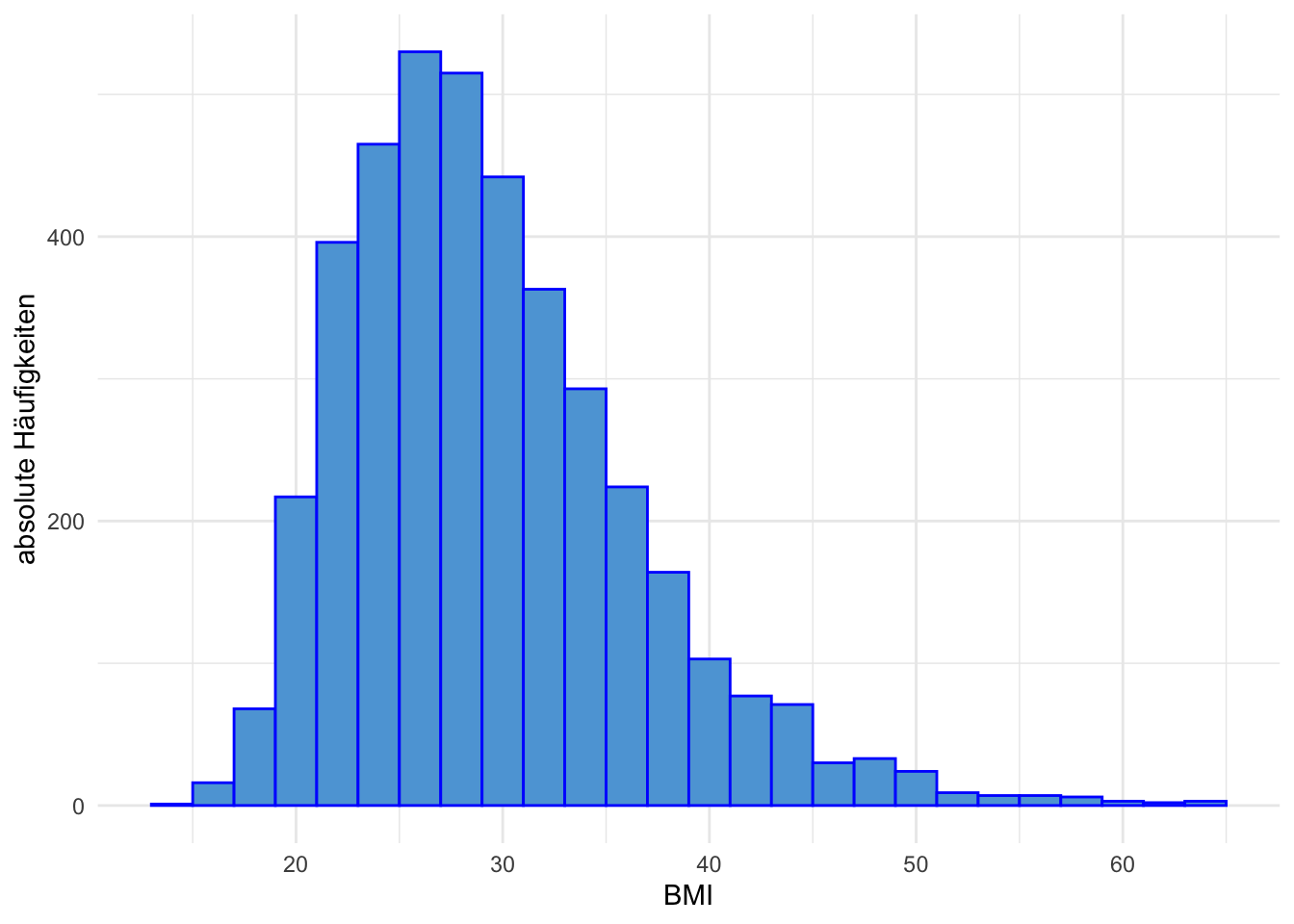 - 27.8 % der Frauen haben einen BMI \(> 25\) und \(\leq 30\)