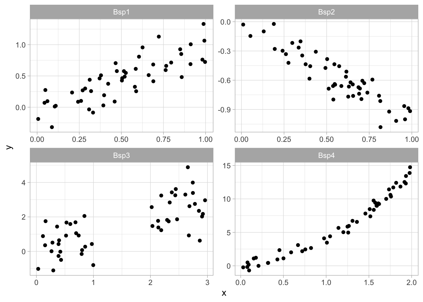 - Geben Sie an, für welchen Zusammenhang (Bsp1 - Bsp4) Sie den Pearsonschen Korrelationskoeffizienten für einen linearen Zusammenhang berechnen dürfen.