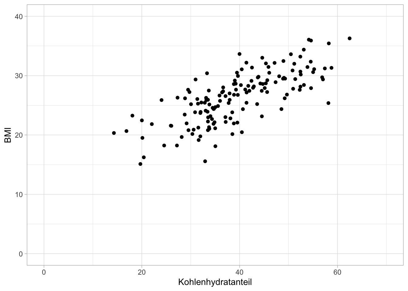 - Wie schaut der funktionale Zusammenhang aus und welchen mittleren BMI kann ich bei einem Anteil von \(40\%\) Kohlenhydrate in der Nahrung erwarten.